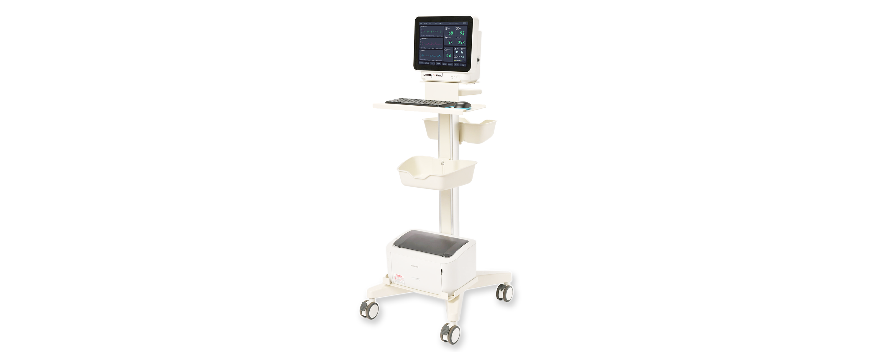 八芯导联线通过粘贴于人体体表的体表电极釆集人体的胸腔阻抗电信号,然后通过血流动力模块对釆集到的人体胸腔阻抗电信号进行处理,之后血流动力模块将处理好的波形数据及参数数据传输至机内CPU板,CPU板将传输过来的波形数据及参数数据集合手动输入的病人的身高、体重、性别参数进行运算,最终将运算所得数据显示在液晶屏上。